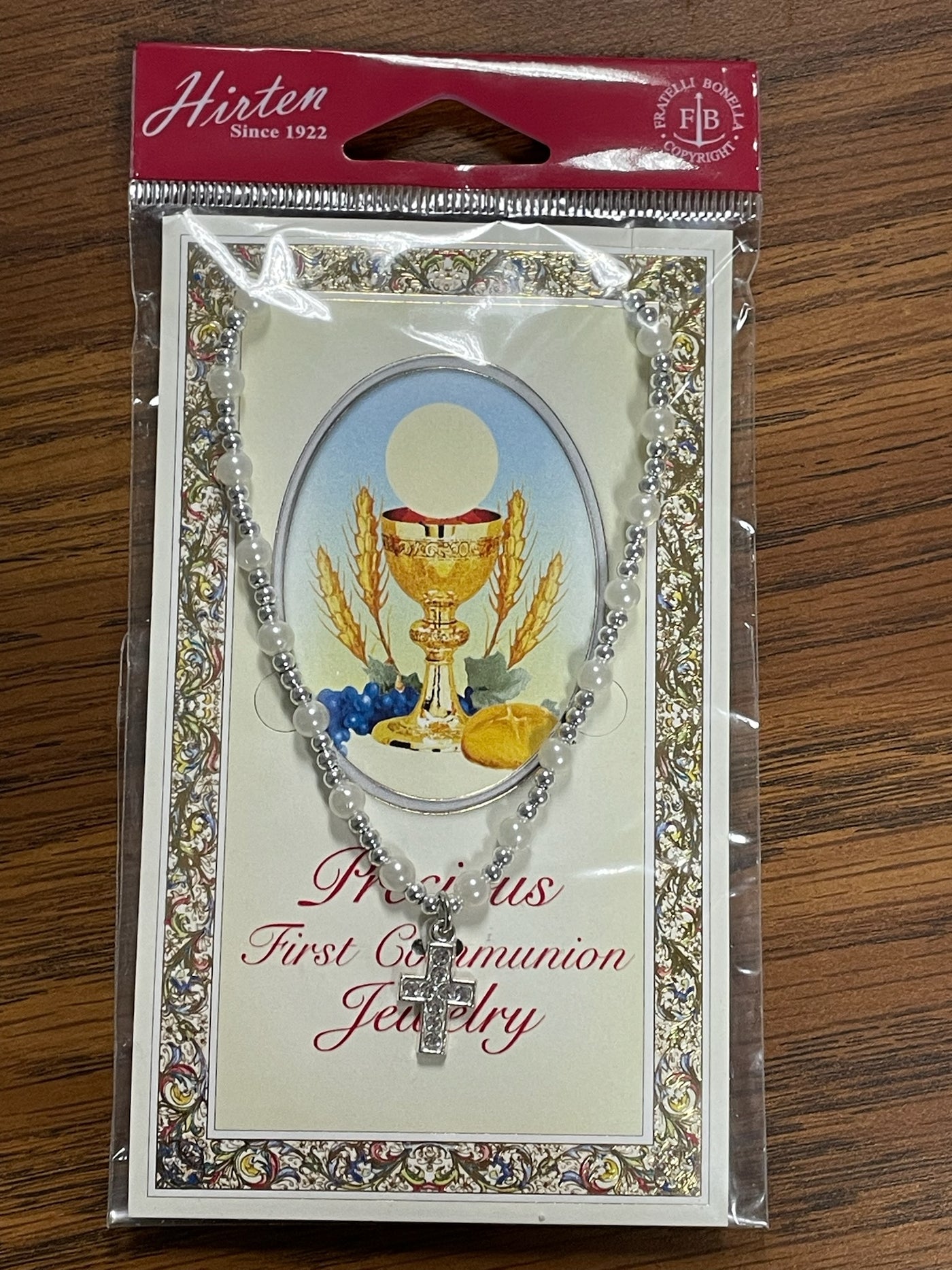 {"id":7379245989955,"title":"6MM WHITE PEARL NECKLACE W\/CRS","handle":"6mm-white-pearl-necklace-w-crs","description":"6mm White Imitation Pearl Bead Necklace with Silver Cross with Crystal Stones Pendant. It has silver toned spacer beads and a 17\" necklace length.","published_at":"2025-02-27T16:39:57","created_at":"2025-02-27T16:39:57","vendor":"HIRTEN","type":"COMMUNION","tags":["Color_White","COMMUNION","Communion and Confirmation","Style_Girl","Type_Communion Jewelry"],"price":1999,"price_min":1999,"price_max":1999,"price_varies":false,"compare_at_price":null,"compare_at_price_min":0,"compare_at_price_max":0,"compare_at_price_varies":true,"all_variant_ids":[42132448870467],"variants":[{"id":42132448870467,"product_id":7379245989955,"product_handle":"6mm-white-pearl-necklace-w-crs","title":"Default Title","option1":"Default Title","option2":null,"option3":null,"sku":"990-0291","requires_shipping":true,"taxable":true,"featured_image":null,"image_id":null,"available":true,"name":"6MM WHITE PEARL NECKLACE W\/CRS - Default Title","options":["Default Title"],"price":1999,"weight":30,"compare_at_price":null,"inventory_quantity":6,"inventory_management":"shopify","inventory_policy":"deny","inventory_in_cart":0,"inventory_remaining":6,"incoming":false,"next_incoming_date":null,"taxable":true,"barcode":null}],"available":true,"images":["\/\/marytowngiftshop.com\/cdn\/shop\/files\/990-0291.jpg?v=1740772654"],"featured_image":"\/\/marytowngiftshop.com\/cdn\/shop\/files\/990-0291.jpg?v=1740772654","options":["Title"],"url":"\/products\/6mm-white-pearl-necklace-w-crs"}