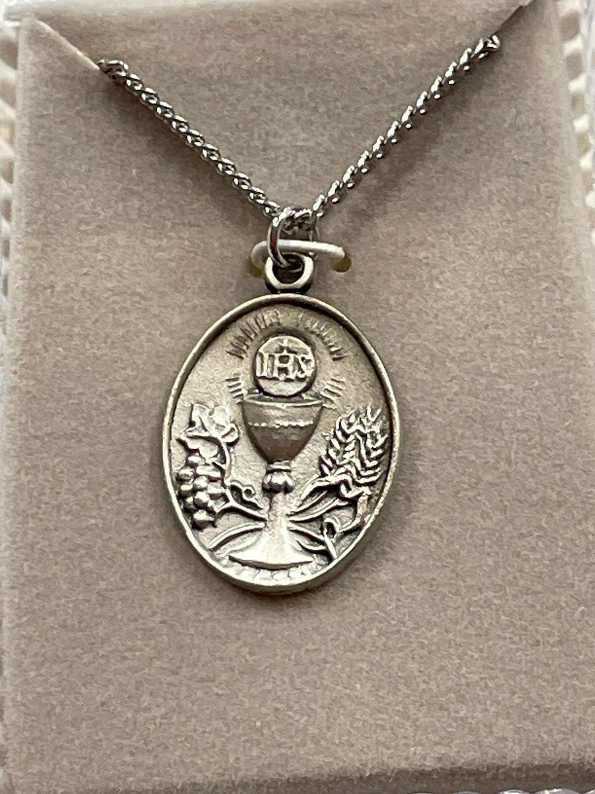 {"id":7379247104067,"title":"COMMUNION MEDAL ON CHAIN BOX","handle":"communion-medal-on-chain-box","description":"Communion Medal Necklace shows a chalice with a host, grapes, and wheat. The back of the medal says, \"Remembrance Of My First Holy Communion.\"","published_at":"2025-02-27T16:40:26","created_at":"2025-02-27T16:40:26","vendor":"HIRTEN","type":"COMMUNION","tags":["COMMUNION","Communion and Confirmation","Type_Communion Jewelry"],"price":1699,"price_min":1699,"price_max":1699,"price_varies":false,"compare_at_price":null,"compare_at_price_min":0,"compare_at_price_max":0,"compare_at_price_varies":true,"all_variant_ids":[42132450246723],"variants":[{"id":42132450246723,"product_id":7379247104067,"product_handle":"communion-medal-on-chain-box","title":"Default Title","option1":"Default Title","option2":null,"option3":null,"sku":"990-0653","requires_shipping":true,"taxable":true,"featured_image":null,"image_id":null,"available":true,"name":"COMMUNION MEDAL ON CHAIN BOX - Default Title","options":["Default Title"],"price":1699,"weight":50,"compare_at_price":null,"inventory_quantity":8,"inventory_management":"shopify","inventory_policy":"deny","inventory_in_cart":0,"inventory_remaining":8,"incoming":false,"next_incoming_date":null,"taxable":true,"barcode":null}],"available":true,"images":["\/\/marytowngiftshop.com\/cdn\/shop\/files\/990-06531.jpg?v=1740781540","\/\/marytowngiftshop.com\/cdn\/shop\/files\/990-06532.jpg?v=1740781540"],"featured_image":"\/\/marytowngiftshop.com\/cdn\/shop\/files\/990-06531.jpg?v=1740781540","options":["Title"],"url":"\/products\/communion-medal-on-chain-box"}