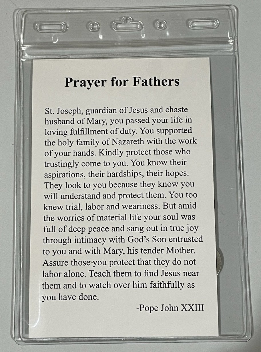 {"id":7398155321411,"title":"PRAYER 4 FATHERS DAY KEYCHAIN","handle":"prayer-4-fathers-day-keychain","description":"Happy Father's Day Key Chain and Prayer Card Set.\u003cbr\u003e\u003cbr\u003eThe front of the key chain shows St. Joseph holding Jesus and says, \"Saint Joseph Pray For Us.\" The back of the key chain says, \"Happy Fathers Day.\"\u003cbr\u003e\u003cbr\u003eIt comes with a card that shows a colorful picture of Saint Joseph holding lillies in one hand and Jesus in the other. It says, \"Prayer For Fathers.\"\u003cbr\u003e\u003cbr\u003eThe back of the card says:\u003cbr\u003ePrayer for Fathers.\u003cbr\u003eSt. Joseph, guardian of Jesus and chaste husband of Mary, you passed your life in loving fulfillment of duty. You supported the holy family of Nazareth with the work of your hands. Kindly protect those who trustingly come to you. You know their aspirations, their hardships, their hopes. They look to you because they know you will understand and protect them. You too knew trial, labor and weariness. But amid the worries of material life your soul was full of deep peace and sang out in true joy through intimacy with God's Son entrusted to you with Mary, his tender Mother. Assure those you protect that they do not labor alone. Teach them to find Jesus near them and to watch over him faithfully as you have done.\u003cbr\u003e-Pope John XXIII\u003cbr\u003e\u003cbr\u003eMade in the USA.","published_at":"2025-04-04T11:09:12","created_at":"2025-04-04T11:09:12","vendor":"Wallace Brothers Manufacturing","type":"CAR ITEMES","tags":["Car Items","Father","Type_Key Chain\/Charm"],"price":899,"price_min":899,"price_max":899,"price_varies":false,"compare_at_price":null,"compare_at_price_min":0,"compare_at_price_max":0,"compare_at_price_varies":true,"all_variant_ids":[42204737568835],"variants":[{"id":42204737568835,"product_id":7398155321411,"product_handle":"prayer-4-fathers-day-keychain","title":"Default Title","option1":"Default Title","option2":null,"option3":null,"sku":"905-0125","requires_shipping":true,"taxable":true,"featured_image":null,"image_id":null,"available":true,"name":"PRAYER 4 FATHERS DAY KEYCHAIN - Default Title","options":["Default Title"],"price":899,"weight":50,"compare_at_price":null,"inventory_quantity":6,"inventory_management":"shopify","inventory_policy":"deny","inventory_in_cart":0,"inventory_remaining":6,"incoming":false,"next_incoming_date":null,"taxable":true,"barcode":null}],"available":true,"images":["\/\/marytowngiftshop.com\/cdn\/shop\/files\/905-01253.jpg?v=1745854209","\/\/marytowngiftshop.com\/cdn\/shop\/files\/905-01251.jpg?v=1745854209","\/\/marytowngiftshop.com\/cdn\/shop\/files\/905-01252.jpg?v=1745854209","\/\/marytowngiftshop.com\/cdn\/shop\/files\/905-01254.jpg?v=1745854209"],"featured_image":"\/\/marytowngiftshop.com\/cdn\/shop\/files\/905-01253.jpg?v=1745854209","options":["Title"],"url":"\/products\/prayer-4-fathers-day-keychain"}