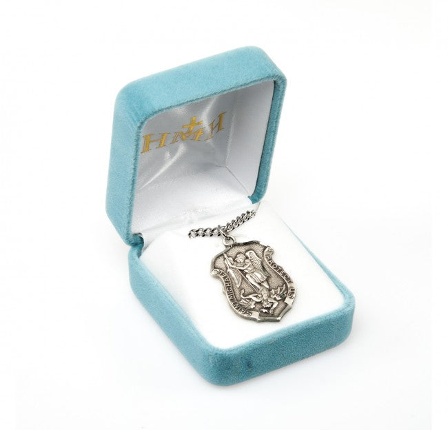 {"id":7505146445891,"title":"SS MED ST MICHAEL BADGE 24\"","handle":"ss-med-st-michael-badge-24","description":"\u003cp\u003eSaint Michael badge medal-pendant.\u003cbr\u003eSolid .925 sterling silver.\u003cbr\u003eDetail depicts Archangel Michael defeating the devil.\u003cbr\u003eSaint Michael the Archangel is the Patron Saint of Police, Law Enforcement.\u003cbr\u003eMedal is die struck.\u003cbr\u003eHand polished and engraved by New England Silversmiths.\u003cbr\u003eDimensions: 1.2\" x 0.8\" (30mm x 21mm)\u003cbr\u003eWeight of medal: 5.6 Grams.\u003cbr\u003e24\" Genuine rhodium plated endless curb chain.\u003cbr\u003eMade in USA.\u003cbr\u003eDeluxe velvet gift box.\u003cbr\u003eMedal has a blank back.\u003c\/p\u003e","published_at":"2025-10-16T12:08:14","created_at":"2025-10-16T12:08:14","vendor":"HMH\/Regina Manufacturing","type":"MEDALS","tags":["Chain Size_24\"","Material_Sterling Silver","Type_Saint Medals"],"price":8600,"price_min":8600,"price_max":8600,"price_varies":false,"compare_at_price":null,"compare_at_price_min":0,"compare_at_price_max":0,"compare_at_price_varies":true,"all_variant_ids":[42639170994243],"variants":[{"id":42639170994243,"product_id":7505146445891,"product_handle":"ss-med-st-michael-badge-24","title":"Default Title","option1":"Default Title","option2":null,"option3":null,"sku":"945-1313","requires_shipping":true,"taxable":true,"featured_image":null,"image_id":null,"available":true,"name":"SS MED ST MICHAEL BADGE 24\" - Default Title","options":["Default Title"],"price":8600,"weight":50,"compare_at_price":null,"inventory_quantity":2,"inventory_management":"shopify","inventory_policy":"deny","inventory_in_cart":0,"inventory_remaining":2,"incoming":null,"next_incoming_date":null,"taxable":true,"barcode":null}],"available":true,"images":["\/\/marytowngiftshop.com\/cdn\/shop\/files\/S160624_1.jpg?v=1760634595","\/\/marytowngiftshop.com\/cdn\/shop\/files\/S1606X.jpg?v=1760634619","\/\/marytowngiftshop.com\/cdn\/shop\/files\/S1606.jpg?v=1760634644"],"featured_image":"\/\/marytowngiftshop.com\/cdn\/shop\/files\/S160624_1.jpg?v=1760634595","options":["Title"],"url":"\/products\/ss-med-st-michael-badge-24"}