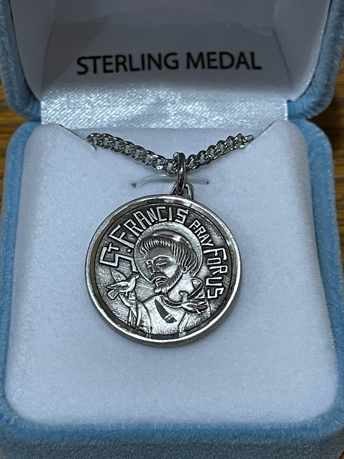 {"id":6727207944259,"title":"SS ST FRANCIS CONTEMPORARY 18\"","handle":"ss-st-francis-contemporary-18","description":"Saint Francis round medal-pendant says, \"St. Francis pray for us.\"\u003cbr\u003eSolid .925 sterling silver.\u003cbr\u003eDetail depicts him with birds.\u003cbr\u003eSaint Francis is the Patron Saint of animals, peace, ecology, and merchants.\u003cbr\u003eMedal is die struck.\u003cbr\u003eHand polished and engraved by New England Silversmiths.\u003cbr\u003eDimensions: 0.9\" x 0.8\" (23mm x 21mm)\u003cbr\u003eWeight of medal: 4.3 Grams.\u003cbr\u003e18\" Genuine rhodium plated curb chain.\u003cbr\u003eMade in USA.\u003cbr\u003eDeluxe velvet gift box.","published_at":"2022-09-01T17:24:44","created_at":"2022-09-01T17:24:44","vendor":"HMH\/Regina Manufacturing","type":"MEDALS","tags":["Chain Size_18\"","Material_Sterling Silver","Type_Saint Medals"],"price":6950,"price_min":6950,"price_max":6950,"price_varies":false,"compare_at_price":null,"compare_at_price_min":0,"compare_at_price_max":0,"compare_at_price_varies":true,"all_variant_ids":[40161470021699],"variants":[{"id":40161470021699,"product_id":6727207944259,"product_handle":"ss-st-francis-contemporary-18","title":"Default Title","option1":"Default Title","option2":null,"option3":null,"sku":"945-1305","requires_shipping":true,"taxable":true,"featured_image":null,"image_id":null,"available":true,"name":"SS ST FRANCIS CONTEMPORARY 18\" - Default Title","options":["Default Title"],"price":6950,"weight":60,"compare_at_price":null,"inventory_quantity":2,"inventory_management":"shopify","inventory_policy":"deny","inventory_in_cart":0,"inventory_remaining":2,"incoming":false,"next_incoming_date":null,"taxable":true,"barcode":null}],"available":true,"images":["\/\/marytowngiftshop.com\/cdn\/shop\/files\/945-1305.jpg?v=1747425205"],"featured_image":"\/\/marytowngiftshop.com\/cdn\/shop\/files\/945-1305.jpg?v=1747425205","options":["Title"],"url":"\/products\/ss-st-francis-contemporary-18"}