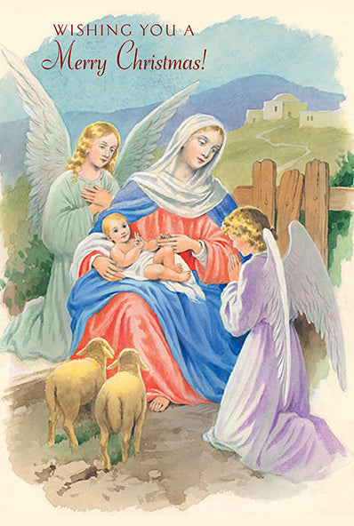 The cover says, "Wishing You A Merry Christmas!" It shows Mary holding Jesus. There are two lambs and two angels kneeling by them. It has gold foil decoration.