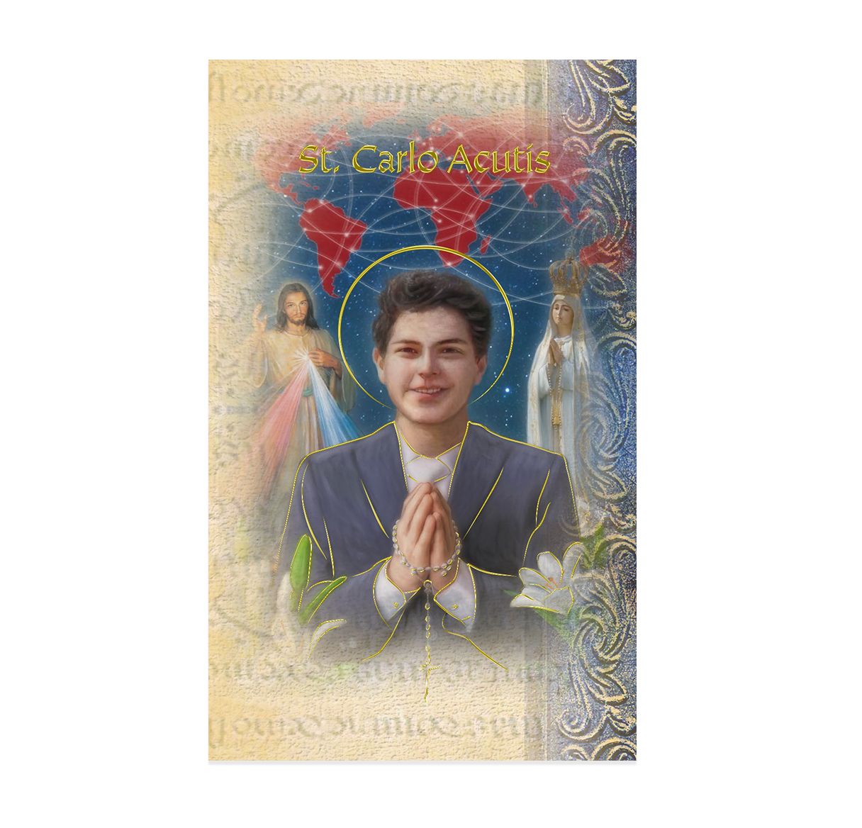 Quality Catholic biography and prayer with exclusive 'Bonella' artwork. Our 'Blessed Carlo Acutis' Biography Card includes two pages of information, the biography, the name meaning, subjects attributes, feast day, and a special prayer. This quality card stock biography is two pages, high-gloss, and includes our exclusive Italian 'Fratelli Bonella' colorful gold-stamped artwork of 'Saint Carlo Acutis', which makes this biography a beautiful work of art. Perfect for handouts at school, CCD, church, or prayer groups.