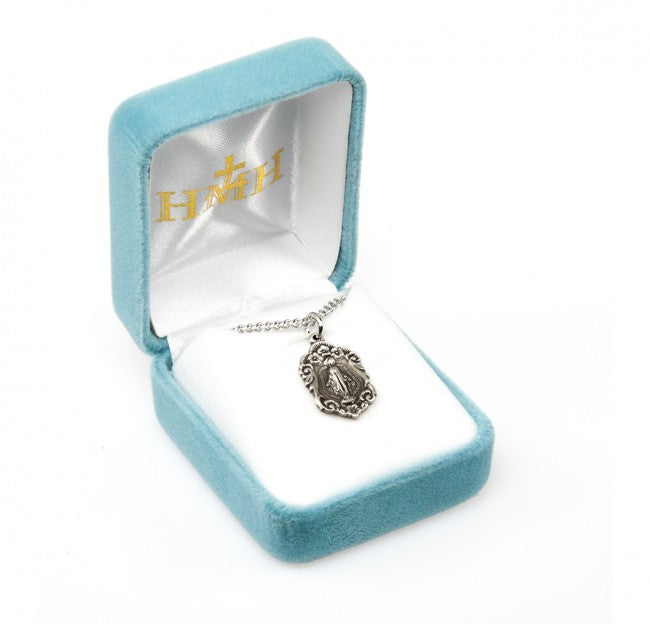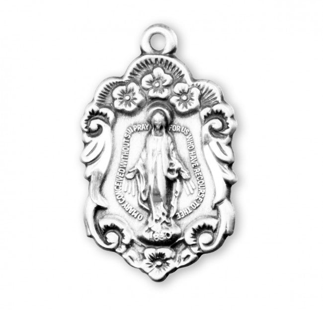 {"id":6727205847107,"title":"SS FANCY BORDER MIRACULOUS","handle":"ss-fancy-border-miraculous","description":"Sterling Silver Miraculous Medal Necklace.\u003cbr\u003eBlessed Mother Mary with rays coming out of her extended hands, crushing a serpent under her feet.\u003cbr\u003eDetail designed double sided pendant with flower and scroll border.\u003cbr\u003eSolid .925 sterling silver.\u003cbr\u003eMedal is die struck.\u003cbr\u003eHand polished and engraved by New England Silversmiths.\u003cbr\u003eDimensions: 0.8\" x 0.5\" (21mm x 13mm)\u003cbr\u003eWeight of medal: 2.0 Grams.\u003cbr\u003e18\" Genuine rhodium plated curb chain.\u003cbr\u003eMade in USA.\u003cbr\u003eDeluxe velvet gift box.","published_at":"2022-09-01T17:23:35","created_at":"2022-09-01T17:23:35","vendor":"HMH\/Regina Manufacturing","type":"MEDALS","tags":["Chain Size_18\"","Material_Sterling Silver","Type_Miraculous Medal"],"price":5200,"price_min":5200,"price_max":5200,"price_varies":false,"compare_at_price":null,"compare_at_price_min":0,"compare_at_price_max":0,"compare_at_price_varies":true,"all_variant_ids":[40161467498563],"variants":[{"id":40161467498563,"product_id":6727205847107,"product_handle":"ss-fancy-border-miraculous","title":"Default Title","option1":"Default Title","option2":null,"option3":null,"sku":"931-0123","requires_shipping":true,"taxable":true,"featured_image":null,"image_id":null,"available":true,"name":"SS FANCY BORDER MIRACULOUS - Default Title","options":["Default Title"],"price":5200,"weight":60,"compare_at_price":null,"inventory_quantity":2,"inventory_management":"shopify","inventory_policy":"deny","inventory_in_cart":0,"inventory_remaining":2,"incoming":false,"next_incoming_date":null,"taxable":true,"barcode":null}],"available":true,"images":["\/\/marytowngiftshop.com\/cdn\/shop\/files\/S1126.jpg?v=1746481988","\/\/marytowngiftshop.com\/cdn\/shop\/files\/S1126X.jpg?v=1746481988","\/\/marytowngiftshop.com\/cdn\/shop\/files\/S112618_1.jpg?v=1746481988"],"featured_image":"\/\/marytowngiftshop.com\/cdn\/shop\/files\/S1126.jpg?v=1746481988","options":["Title"],"url":"\/products\/ss-fancy-border-miraculous"}