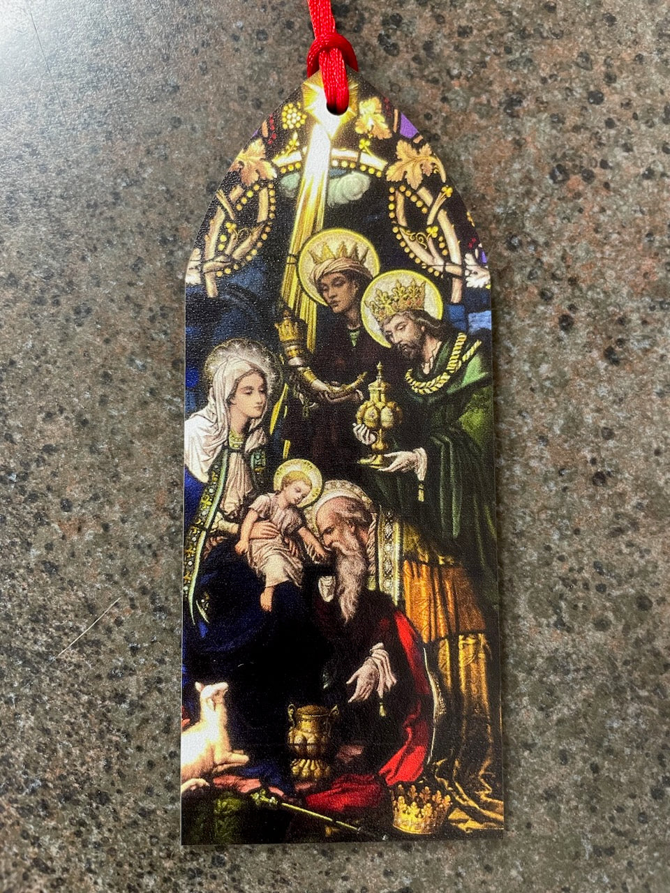 The Christmas ornament looks like a picture in a stained glass window. It shows the three Wise Men bringing gifts to Mary with Jesus on her lap.