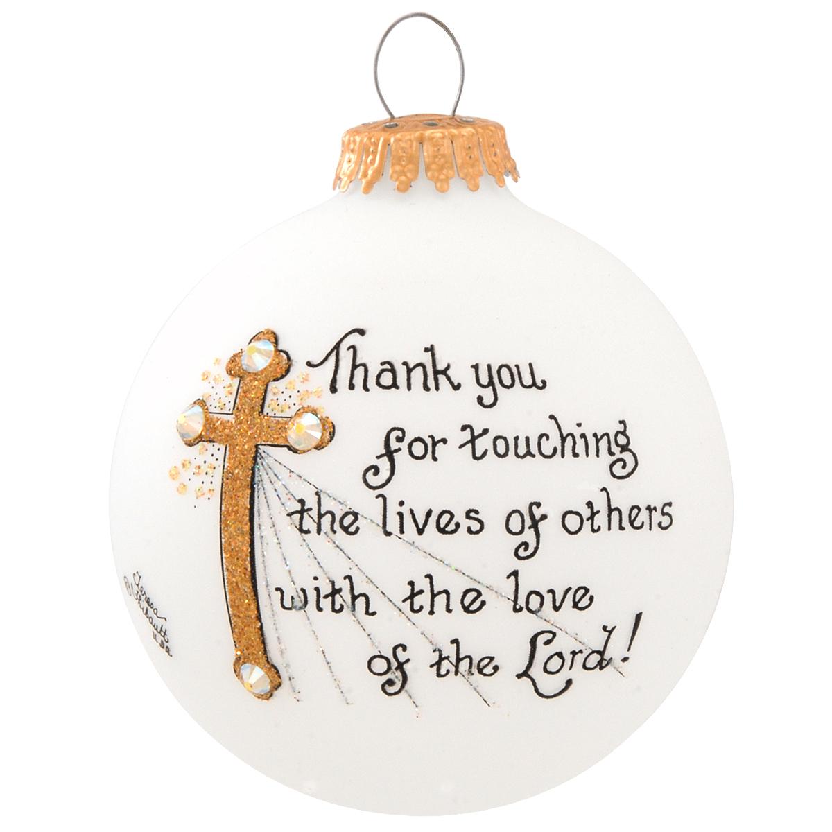 {"id":4594894831683,"title":"CROSS MINISTRY ORNAMENT","handle":"cross-ministry-ornament","description":"It is a round white ornament with a glittery gold cross with hand applied Swarovski crystals. It says, \"Thank you for touching the lives of others with the love of the Lord!\" Made in the USA.","published_at":"2022-01-31T15:26:00","created_at":"2020-11-06T17:52:53","vendor":"Bronners Christmas Wonderland","type":"CHRISTMAS","tags":["Type_Ornament"],"price":3799,"price_min":3799,"price_max":3799,"price_varies":false,"compare_at_price":0,"compare_at_price_min":0,"compare_at_price_max":0,"compare_at_price_varies":false,"all_variant_ids":[32165380227139],"variants":[{"id":32165380227139,"product_id":4594894831683,"product_handle":"cross-ministry-ornament","title":"Default Title","option1":"Default Title","option2":null,"option3":null,"sku":"982-0038","requires_shipping":true,"taxable":true,"featured_image":null,"image_id":null,"available":true,"name":"CROSS MINISTRY ORNAMENT - Default Title","options":["Default Title"],"price":3799,"weight":90,"compare_at_price":0,"inventory_quantity":20,"inventory_management":"shopify","inventory_policy":"deny","inventory_in_cart":0,"inventory_remaining":20,"incoming":false,"next_incoming_date":null,"taxable":true,"barcode":""}],"available":true,"images":["\/\/www.marytowngiftshop.com\/cdn\/shop\/products\/980-0565.jpg?v=1604940896"],"featured_image":"\/\/www.marytowngiftshop.com\/cdn\/shop\/products\/980-0565.jpg?v=1604940896","options":["Title"],"url":"\/products\/cross-ministry-ornament"}