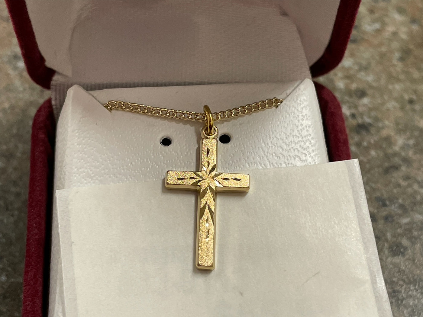 {"id":6811301150787,"title":"G\/SS ENG CROSS 18\" CHAIN\/BX","handle":"g-ss-eng-cross-18-chain-bx-1","description":"18KT Gold on Sterling Silver Engraved Cross 0.75\"\u003cbr\u003e\u003cbr\u003eNecklace comes on a 18\" gold plated chain and in a box.","published_at":"2023-06-01T10:50:32","created_at":"2023-06-01T10:50:32","vendor":"McVan Inc. \u0026 Piccolo Italia","type":"MEDALS","tags":["Chain Size_18\"","Cross's and Crucifix's","Material_Gold over Sterling","Type_Cross"],"price":5500,"price_min":5500,"price_max":5500,"price_varies":false,"compare_at_price":null,"compare_at_price_min":0,"compare_at_price_max":0,"compare_at_price_varies":true,"all_variant_ids":[40517334990915],"variants":[{"id":40517334990915,"product_id":6811301150787,"product_handle":"g-ss-eng-cross-18-chain-bx-1","title":"Default Title","option1":"Default Title","option2":null,"option3":null,"sku":"933-0113","requires_shipping":true,"taxable":true,"featured_image":null,"image_id":null,"available":true,"name":"G\/SS ENG CROSS 18\" CHAIN\/BX - Default Title","options":["Default Title"],"price":5500,"weight":60,"compare_at_price":null,"inventory_quantity":1,"inventory_management":"shopify","inventory_policy":"deny","inventory_in_cart":0,"inventory_remaining":1,"incoming":false,"next_incoming_date":null,"taxable":true,"barcode":null}],"available":true,"images":["\/\/www.marytowngiftshop.com\/cdn\/shop\/files\/933-0113.jpg?v=1702484375"],"featured_image":"\/\/www.marytowngiftshop.com\/cdn\/shop\/files\/933-0113.jpg?v=1702484375","options":["Title"],"url":"\/products\/g-ss-eng-cross-18-chain-bx-1"}