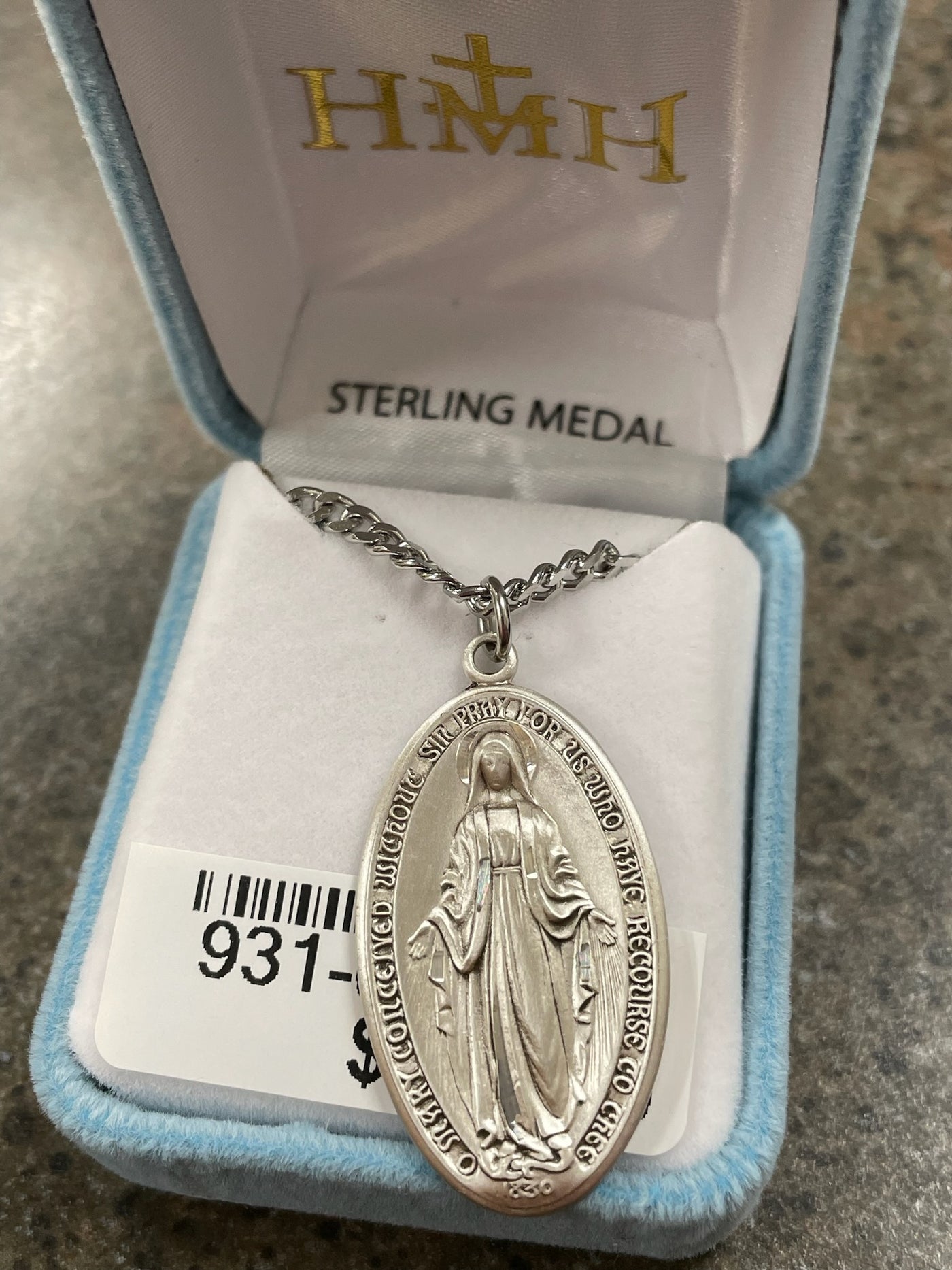 {"id":6727206174787,"title":"SS MEDIUM OVAL MIRACULOUS 24\"","handle":"ss-medium-oval-miraculous-24","description":"Blessed Mother Mary with rays coming out of her extended hands, crushing a serpent under her feet.\u003cbr\u003eOval shaped double sided pendant.\u003cbr\u003eSolid .925 sterling silver.\u003cbr\u003eMedal is die struck.\u003cbr\u003eHand polished and engraved by New England Silversmiths.\u003cbr\u003eDimensions: 1.4\" x 0.8\" (36mm x 20mm)\u003cbr\u003eWeight of medal: 8.0 Grams.\u003cbr\u003e24\" Genuine rhodium plated endless curb chain.\u003cbr\u003eMade in USA.\u003cbr\u003eDeluxe velvet gift box.","published_at":"2022-09-01T17:23:46","created_at":"2022-09-01T17:23:46","vendor":"HMH\/Regina Manufacturing","type":"MEDALS","tags":["Chain Size_24\"","Material_Sterling Silver","Type_Miraculous Medal"],"price":9400,"price_min":9400,"price_max":9400,"price_varies":false,"compare_at_price":null,"compare_at_price_min":0,"compare_at_price_max":0,"compare_at_price_varies":true,"all_variant_ids":[40161467924547],"variants":[{"id":40161467924547,"product_id":6727206174787,"product_handle":"ss-medium-oval-miraculous-24","title":"Default Title","option1":"Default Title","option2":null,"option3":null,"sku":"931-0130","requires_shipping":true,"taxable":true,"featured_image":null,"image_id":null,"available":true,"name":"SS MEDIUM OVAL MIRACULOUS 24\" - Default Title","options":["Default Title"],"price":9400,"weight":60,"compare_at_price":null,"inventory_quantity":1,"inventory_management":"shopify","inventory_policy":"deny","inventory_in_cart":0,"inventory_remaining":1,"incoming":false,"next_incoming_date":null,"taxable":true,"barcode":null}],"available":true,"images":["\/\/www.marytowngiftshop.com\/cdn\/shop\/files\/931-0130.jpg?v=1701813458"],"featured_image":"\/\/www.marytowngiftshop.com\/cdn\/shop\/files\/931-0130.jpg?v=1701813458","options":["Title"],"url":"\/products\/ss-medium-oval-miraculous-24"}