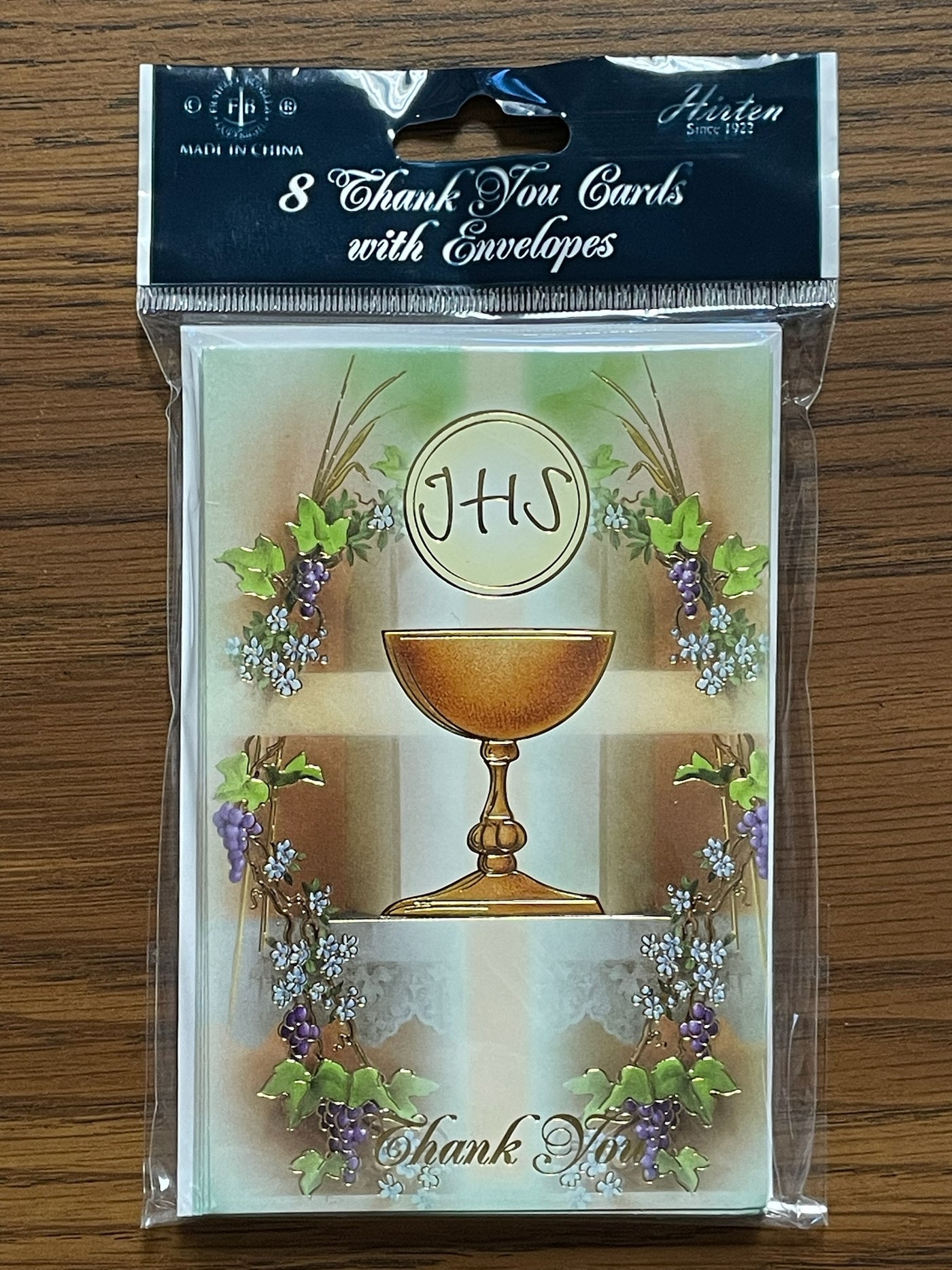 {"id":7379247497283,"title":"FIRST COMM CHALICE THANK YOU","handle":"first-comm-chalice-thank-you","description":"Thank You Cards for First Communion Gifts.\u003cbr\u003eChalice and Grapes image.\u003cbr\u003eGold embossed design.\u003cbr\u003eCards size: 3 1\/2\" x 5 1\/4\" (90mm x 133mm) 3.5\" x 5.25\".\u003cbr\u003eSold in packs of 8.\u003cbr\u003eEnvelopes included.\u003cbr\u003e\u003cbr\u003eCard says, \"Thank you for helping to make my First Holy Communion Day very special!\"","published_at":"2025-02-27T16:40:39","created_at":"2025-02-27T16:40:39","vendor":"HIRTEN","type":"COMMUNION","tags":["COMMUNION","Communion and Confirmation","Stationery","Style_Communion","Style_Thank You","Type_Packaged Cards"],"price":699,"price_min":699,"price_max":699,"price_varies":false,"compare_at_price":null,"compare_at_price_min":0,"compare_at_price_max":0,"compare_at_price_varies":true,"all_variant_ids":[42132450639939],"variants":[{"id":42132450639939,"product_id":7379247497283,"product_handle":"first-comm-chalice-thank-you","title":"Default Title","option1":"Default Title","option2":null,"option3":null,"sku":"990-0031","requires_shipping":true,"taxable":true,"featured_image":null,"image_id":null,"available":true,"name":"FIRST COMM CHALICE THANK YOU - Default Title","options":["Default Title"],"price":699,"weight":80,"compare_at_price":null,"inventory_quantity":3,"inventory_management":"shopify","inventory_policy":"deny","inventory_in_cart":0,"inventory_remaining":3,"incoming":false,"next_incoming_date":null,"taxable":true,"barcode":null}],"available":true,"images":["\/\/www.marytowngiftshop.com\/cdn\/shop\/files\/990-0031.jpg?v=1740775965"],"featured_image":"\/\/www.marytowngiftshop.com\/cdn\/shop\/files\/990-0031.jpg?v=1740775965","options":["Title"],"url":"\/products\/first-comm-chalice-thank-you"}
