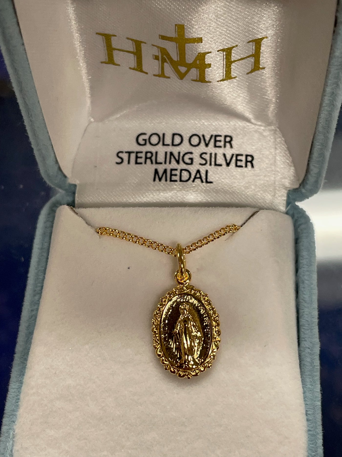 {"id":6727205224515,"title":"16K GP SCALLOP MIRAC 18\"","handle":"16k-gp-scallop-mirac-18","description":"Miraculous Medal Necklace.\u003cbr\u003eBlessed Mother Mary with rays coming out of her extended hands, crushing a serpent under her feet.\u003cbr\u003eOval shaped double sided pendant.\u003cbr\u003e16kt Gold over solid .925 sterling silver.\u003cbr\u003eMedal is die struck.\u003cbr\u003eHand polished and engraved by New England Silversmiths.\u003cbr\u003eDimensions: 0.7\" x 0.4\" 17mm x 11mm)\u003cbr\u003eWeight of medal: 1.3 Grams.\u003cbr\u003e18\" Genuine gold plated curb chain.\u003cbr\u003eMade in USA.\u003cbr\u003eDeluxe velvet gift box.","published_at":"2022-09-01T17:23:01","created_at":"2022-09-01T17:23:01","vendor":"HMH\/Regina Manufacturing","type":"MEDALS","tags":["Chain Size_18\"","Material_Gold over Sterling","Type_Miraculous Medal"],"price":6250,"price_min":6250,"price_max":6250,"price_varies":false,"compare_at_price":null,"compare_at_price_min":0,"compare_at_price_max":0,"compare_at_price_varies":true,"all_variant_ids":[40161465565251],"variants":[{"id":40161465565251,"product_id":6727205224515,"product_handle":"16k-gp-scallop-mirac-18","title":"Default Title","option1":"Default Title","option2":null,"option3":null,"sku":"931-0146","requires_shipping":true,"taxable":true,"featured_image":null,"image_id":null,"available":true,"name":"16K GP SCALLOP MIRAC 18\" - Default Title","options":["Default Title"],"price":6250,"weight":60,"compare_at_price":null,"inventory_quantity":2,"inventory_management":"shopify","inventory_policy":"deny","inventory_in_cart":0,"inventory_remaining":2,"incoming":false,"next_incoming_date":null,"taxable":true,"barcode":null}],"available":true,"images":["\/\/www.marytowngiftshop.com\/cdn\/shop\/files\/931-0146.jpg?v=1748377236"],"featured_image":"\/\/www.marytowngiftshop.com\/cdn\/shop\/files\/931-0146.jpg?v=1748377236","options":["Title"],"url":"\/products\/16k-gp-scallop-mirac-18"}