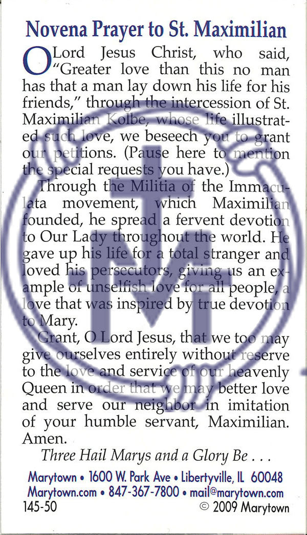 {"id":6641819156547,"title":"NOVENA PRAYER TO ST MAX PAPER","handle":"novena-prayer-to-st-max-paper-1","description":"Individual Paper Prayer Card\u003cbr\u003e\u003cbr\u003eIt has a Novena Prayer to St. Maximilian. The picture on the other side shows Maximilian Kolbe holding books and with the concentration camp prisoner uniform jacket draped on his shoulder.","published_at":"2022-01-08T10:54:10","created_at":"2022-01-08T10:54:10","vendor":"Marytown Press","type":"PRAYER CARD","tags":[],"price":50,"price_min":50,"price_max":50,"price_varies":false,"compare_at_price":null,"compare_at_price_min":0,"compare_at_price_max":0,"compare_at_price_varies":true,"all_variant_ids":[39712027639875],"variants":[{"id":39712027639875,"product_id":6641819156547,"product_handle":"novena-prayer-to-st-max-paper-1","title":"Default Title","option1":"Default Title","option2":null,"option3":null,"sku":"800-0018","requires_shipping":true,"taxable":true,"featured_image":null,"image_id":null,"available":false,"name":"NOVENA PRAYER TO ST MAX PAPER - Default Title","options":["Default Title"],"price":50,"weight":20,"compare_at_price":null,"inventory_quantity":0,"inventory_management":"shopify","inventory_policy":"deny","inventory_in_cart":0,"inventory_remaining":0,"incoming":false,"next_incoming_date":null,"taxable":true,"barcode":null}],"available":false,"images":["\/\/www.marytowngiftshop.com\/cdn\/shop\/products\/800-00181.jpg?v=1664815926","\/\/www.marytowngiftshop.com\/cdn\/shop\/products\/800-00182.jpg?v=1664815926"],"featured_image":"\/\/www.marytowngiftshop.com\/cdn\/shop\/products\/800-00181.jpg?v=1664815926","options":["Title"],"url":"\/products\/novena-prayer-to-st-max-paper-1"}