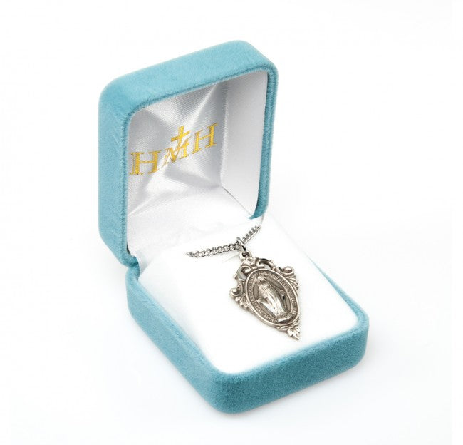 {"id":6732493127747,"title":"SS FANCY MIRACULOUS W\/CRWN 18\"","handle":"ss-fancy-miraculous-w-crwn-18","description":"1-3\/16\" x 13\/16\" Sterling Silver Fancy Miraculous Medal With Pierced Scroll Necklace.\u003cbr\u003e\u003cbr\u003eBlessed Mother Mary with rays coming out of her extended hands, crushing a serpent under her feet.\u003cbr\u003eOval shaped double sided pendant with a fancy border.\u003cbr\u003e.925 sterling silver.\u003cbr\u003eMedal is die struck.\u003cbr\u003eHand polished and engraved by New England Silversmiths.\u003cbr\u003eDimensions: 1.2\" x 0.8\" (30mm x 20mm)\u003cbr\u003eWeight of medal: 3.9 Grams.\u003cbr\u003e18\" Genuine rhodium plated curb chain.\u003cbr\u003eMade in USA.\u003cbr\u003eDeluxe velvet gift box.","published_at":"2022-09-12T12:07:36","created_at":"2022-09-12T12:07:36","vendor":"HMH\/Regina Manufacturing","type":"MEDALS","tags":["Chain Size_18\"","Material_Sterling Silver","Type_Miraculous Medal"],"price":7200,"price_min":7200,"price_max":7200,"price_varies":false,"compare_at_price":null,"compare_at_price_min":0,"compare_at_price_max":0,"compare_at_price_varies":true,"all_variant_ids":[40186953236547],"variants":[{"id":40186953236547,"product_id":6732493127747,"product_handle":"ss-fancy-miraculous-w-crwn-18","title":"Default Title","option1":"Default Title","option2":null,"option3":null,"sku":"931-0150","requires_shipping":true,"taxable":true,"featured_image":null,"image_id":null,"available":true,"name":"SS FANCY MIRACULOUS W\/CRWN 18\" - Default Title","options":["Default Title"],"price":7200,"weight":60,"compare_at_price":null,"inventory_quantity":3,"inventory_management":"shopify","inventory_policy":"deny","inventory_in_cart":0,"inventory_remaining":3,"incoming":false,"next_incoming_date":null,"taxable":true,"barcode":null}],"available":true,"images":["\/\/www.marytowngiftshop.com\/cdn\/shop\/files\/S317018_1.jpg?v=1746543498","\/\/www.marytowngiftshop.com\/cdn\/shop\/files\/S3170X.jpg?v=1746543528","\/\/www.marytowngiftshop.com\/cdn\/shop\/files\/S3170.jpg?v=1746543925","\/\/www.marytowngiftshop.com\/cdn\/shop\/files\/S3170B.jpg?v=1746543951"],"featured_image":"\/\/www.marytowngiftshop.com\/cdn\/shop\/files\/S317018_1.jpg?v=1746543498","options":["Title"],"url":"\/products\/ss-fancy-miraculous-w-crwn-18"}