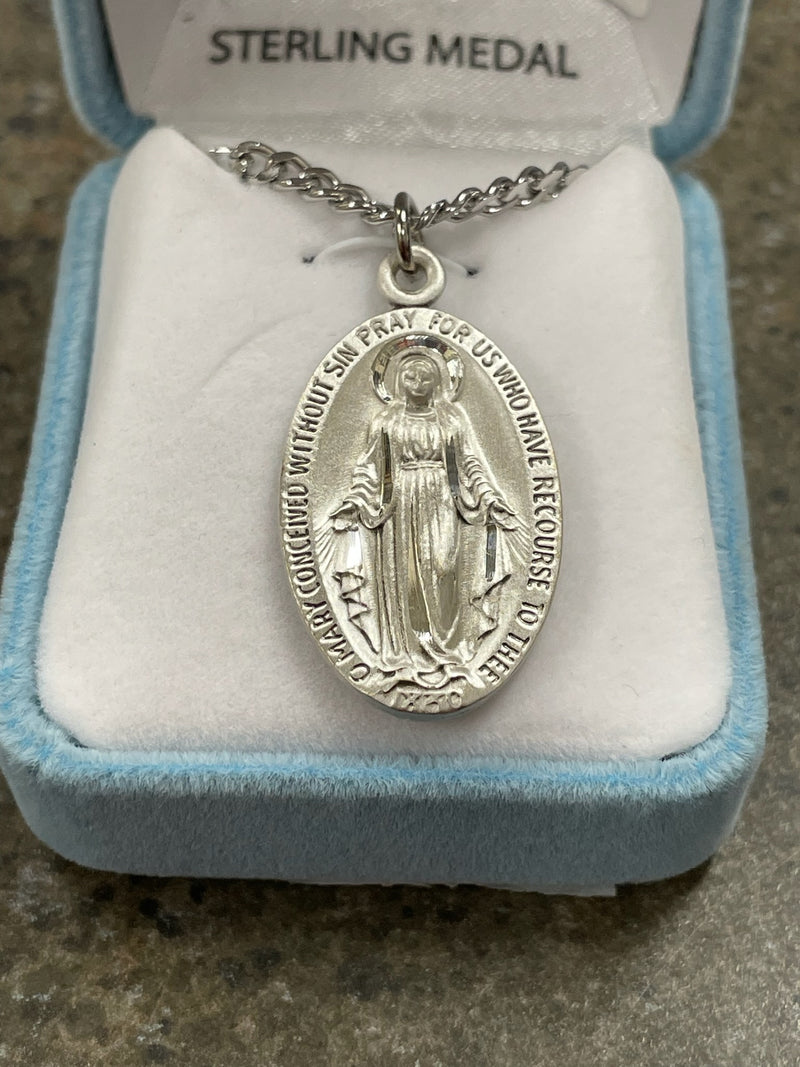 {"id":6727206142019,"title":"SS MEDIUM MIRACULOUS 24\"","handle":"ss-medium-miraculous-24","description":"Blessed Mother Mary with rays coming out of her extended hands, crushing a serpent under her feet.\u003cbr\u003eOval shaped double sided pendant.\u003cbr\u003eSolid .925 sterling silver.\u003cbr\u003eMedal is die struck.\u003cbr\u003eHand polished and engraved by New England Silversmiths.\u003cbr\u003eDimensions: 1.2\" x 0.7\"(31mm x 17mm)\u003cbr\u003eWeight of medal: 5.5 Grams.\u003cbr\u003e24\" Genuine rhodium plated endless curb chain.\u003cbr\u003eMade in USA.\u003cbr\u003eDeluxe velvet gift box.","published_at":"2022-09-01T17:23:45","created_at":"2022-09-01T17:23:45","vendor":"HMH\/Regina Manufacturing","type":"MEDALS","tags":["Chain Size_24\"","Material_Sterling Silver","Type_Miraculous Medal"],"price":7900,"price_min":7900,"price_max":7900,"price_varies":false,"compare_at_price":null,"compare_at_price_min":0,"compare_at_price_max":0,"compare_at_price_varies":true,"all_variant_ids":[40161467891779],"variants":[{"id":40161467891779,"product_id":6727206142019,"product_handle":"ss-medium-miraculous-24","title":"Default Title","option1":"Default Title","option2":null,"option3":null,"sku":"931-0093","requires_shipping":true,"taxable":true,"featured_image":null,"image_id":null,"available":true,"name":"SS MEDIUM MIRACULOUS 24\" - Default Title","options":["Default Title"],"price":7900,"weight":70,"compare_at_price":null,"inventory_quantity":1,"inventory_management":"shopify","inventory_policy":"deny","inventory_in_cart":0,"inventory_remaining":1,"incoming":false,"next_incoming_date":null,"taxable":true,"barcode":""}],"available":true,"images":["\/\/www.marytowngiftshop.com\/cdn\/shop\/products\/931-0093.jpg?v=1681764264"],"featured_image":"\/\/www.marytowngiftshop.com\/cdn\/shop\/products\/931-0093.jpg?v=1681764264","options":["Title"],"url":"\/products\/ss-medium-miraculous-24"}