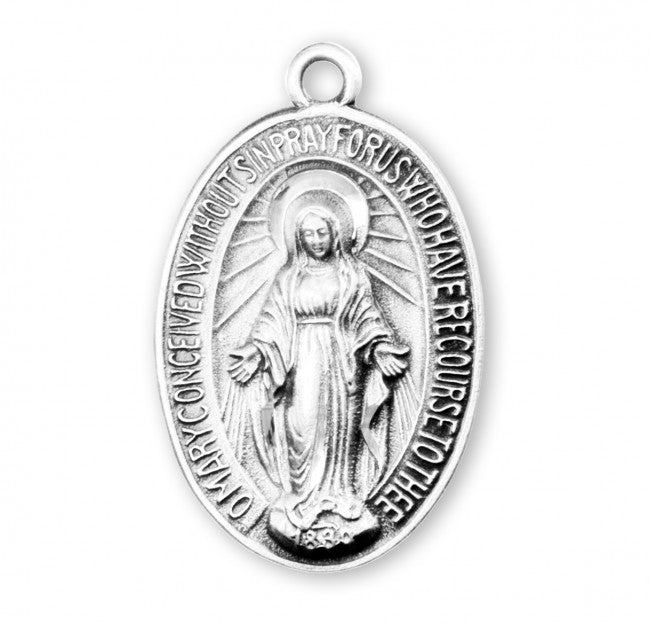 {"id":6727206502467,"title":"SS OVAL MIRACULOUS","handle":"ss-oval-miraculous","description":"Sterling Silver Oval Miraculous Medal Necklace.\u003cbr\u003e\u003cbr\u003eBlessed Mother Mary with rays coming out of her extended hands, crushing a serpent under her feet.\u003cbr\u003eOval shaped double sided pendant.\u003cbr\u003eSolid .925 sterling silver.\u003cbr\u003eMedal is die struck.\u003cbr\u003eHand polished and engraved by New England Silversmiths.\u003cbr\u003eDimensions: 1.1\" x 0.7\" (27mm x 17mm)\u003cbr\u003eWeight of medal: 4.5 Grams.\u003cbr\u003e24\" Genuine rhodium plated endless curb chain.\u003cbr\u003eMade in USA.\u003cbr\u003eDeluxe velvet gift box.","published_at":"2022-09-01T17:23:55","created_at":"2022-09-01T17:23:55","vendor":"HMH\/Regina Manufacturing","type":"MEDALS","tags":["Chain Size_24\"","Material_Sterling Silver","Type_Miraculous Medal"],"price":7450,"price_min":7450,"price_max":7450,"price_varies":false,"compare_at_price":null,"compare_at_price_min":0,"compare_at_price_max":0,"compare_at_price_varies":true,"all_variant_ids":[40161468579907],"variants":[{"id":40161468579907,"product_id":6727206502467,"product_handle":"ss-oval-miraculous","title":"Default Title","option1":"Default Title","option2":null,"option3":null,"sku":"931-0095","requires_shipping":true,"taxable":true,"featured_image":null,"image_id":null,"available":true,"name":"SS OVAL MIRACULOUS - Default Title","options":["Default Title"],"price":7450,"weight":60,"compare_at_price":null,"inventory_quantity":2,"inventory_management":"shopify","inventory_policy":"deny","inventory_in_cart":0,"inventory_remaining":2,"incoming":false,"next_incoming_date":null,"taxable":true,"barcode":null}],"available":true,"images":["\/\/www.marytowngiftshop.com\/cdn\/shop\/files\/S3150_1.jpg?v=1746740876","\/\/www.marytowngiftshop.com\/cdn\/shop\/files\/S3150X.jpg?v=1746740897"],"featured_image":"\/\/www.marytowngiftshop.com\/cdn\/shop\/files\/S3150_1.jpg?v=1746740876","options":["Title"],"url":"\/products\/ss-oval-miraculous"}
