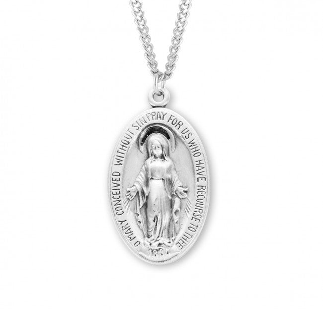 {"id":6727206699075,"title":"SS OVAL MIRACULOUS 24\"","handle":"ss-oval-miraculous-24","description":"Sterling Silver Miraculous Medal Necklace. \u003cbr\u003e\u003cbr\u003eBlessed Mother Mary with rays coming out of her extended hands, crushing a serpent under her feet.\u003cbr\u003eOval shaped double sided pendant.\u003cbr\u003eSolid .925 sterling silver.\u003cbr\u003eMedal is die struck.\u003cbr\u003eHand polished and engraved by New England Silversmiths.\u003cbr\u003eDimensions: 1.4\" x 0.8\" (35mm x 21mm)\u003cbr\u003eWeight of medal: 7.8 Grams.\u003cbr\u003e24\" Genuine rhodium plated endless curb chain.\u003cbr\u003eMade in USA.\u003cbr\u003eDeluxe velvet gift box.","published_at":"2022-09-01T17:24:02","created_at":"2022-09-01T17:24:02","vendor":"HMH\/Regina Manufacturing","type":"MEDALS","tags":["Chain Size_24\"","Material_Sterling Silver","Type_Miraculous Medal"],"price":7900,"price_min":7900,"price_max":7900,"price_varies":false,"compare_at_price":null,"compare_at_price_min":0,"compare_at_price_max":0,"compare_at_price_varies":true,"all_variant_ids":[40161468776515],"variants":[{"id":40161468776515,"product_id":6727206699075,"product_handle":"ss-oval-miraculous-24","title":"Default Title","option1":"Default Title","option2":null,"option3":null,"sku":"931-0129","requires_shipping":true,"taxable":true,"featured_image":null,"image_id":null,"available":true,"name":"SS OVAL MIRACULOUS 24\" - Default Title","options":["Default Title"],"price":7900,"weight":60,"compare_at_price":null,"inventory_quantity":1,"inventory_management":"shopify","inventory_policy":"deny","inventory_in_cart":0,"inventory_remaining":1,"incoming":false,"next_incoming_date":null,"taxable":true,"barcode":null}],"available":true,"images":["\/\/www.marytowngiftshop.com\/cdn\/shop\/files\/S1109X.jpg?v=1746805349","\/\/www.marytowngiftshop.com\/cdn\/shop\/files\/S1109.jpg?v=1746805349","\/\/www.marytowngiftshop.com\/cdn\/shop\/files\/S110924_1.jpg?v=1746805349"],"featured_image":"\/\/www.marytowngiftshop.com\/cdn\/shop\/files\/S1109X.jpg?v=1746805349","options":["Title"],"url":"\/products\/ss-oval-miraculous-24"}