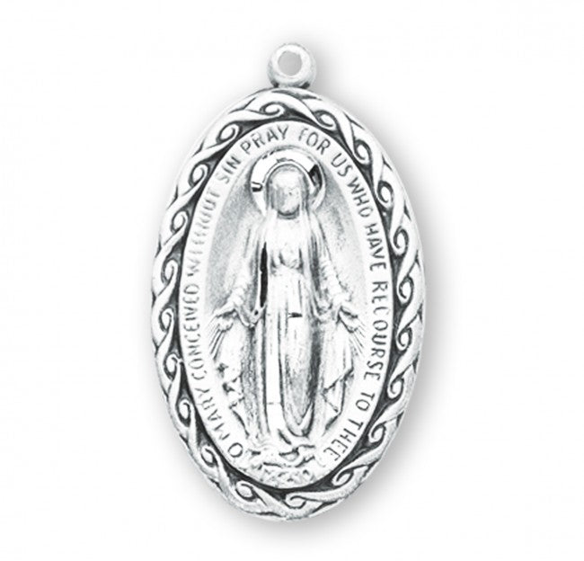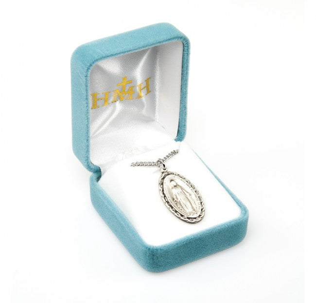 {"id":6727207125059,"title":"SS ROPED EDGE MIRACULOUS 18\"","handle":"ss-roped-edge-miraculous-18","description":"Sterling Silver Miraculous Medal with Roped edge.\u003cbr\u003e\u003cbr\u003eBlessed Mother Mary with rays coming out of her extended hands, crushing a serpent under her feet.\u003cbr\u003eOval shaped double sided pendant.\u003cbr\u003eMedal is die struck.\u003cbr\u003eHand polished and engraved by New England Silversmiths.\u003cbr\u003eDimensions: 1.1\" x 0.6\" (28mm x 16mm)\u003cbr\u003eWeight of medal: 4.2 Grams.\u003cbr\u003e18\" Genuine rhodium plated curb chain.\u003cbr\u003eMade in USA.\u003cbr\u003eDeluxe velvet gift box.","published_at":"2022-09-01T17:24:16","created_at":"2022-09-01T17:24:16","vendor":"HMH\/Regina Manufacturing","type":"MEDALS","tags":["Chain Size_18\"","Material_Sterling Silver","Type_Miraculous Medal"],"price":6400,"price_min":6400,"price_max":6400,"price_varies":false,"compare_at_price":null,"compare_at_price_min":0,"compare_at_price_max":0,"compare_at_price_varies":true,"all_variant_ids":[40161469202499],"variants":[{"id":40161469202499,"product_id":6727207125059,"product_handle":"ss-roped-edge-miraculous-18","title":"Default Title","option1":"Default Title","option2":null,"option3":null,"sku":"931-0100","requires_shipping":true,"taxable":true,"featured_image":null,"image_id":null,"available":false,"name":"SS ROPED EDGE MIRACULOUS 18\" - Default Title","options":["Default Title"],"price":6400,"weight":60,"compare_at_price":null,"inventory_quantity":0,"inventory_management":"shopify","inventory_policy":"deny","inventory_in_cart":0,"inventory_remaining":0,"incoming":false,"next_incoming_date":null,"taxable":true,"barcode":null}],"available":false,"images":["\/\/www.marytowngiftshop.com\/cdn\/shop\/files\/S314518_1.jpg?v=1746807628","\/\/www.marytowngiftshop.com\/cdn\/shop\/files\/S3145X.jpg?v=1746807653","\/\/www.marytowngiftshop.com\/cdn\/shop\/files\/S3145.jpg?v=1746807695"],"featured_image":"\/\/www.marytowngiftshop.com\/cdn\/shop\/files\/S314518_1.jpg?v=1746807628","options":["Title"],"url":"\/products\/ss-roped-edge-miraculous-18"}